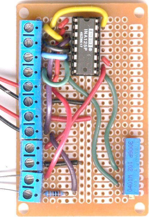 Yeah, the photo is a little different from the drawing. I drew it for clarity Note that three of the black wires in the wiring chart are not necessary, and in fact are not included on the actual board. They are the wires going from pins 5 and 12 of the chip to ground, and from one side of the ground to the other. The extra wires are drawn-in to make it really clear what connects to what. In reality, I just soldered a jumper on the underside from pin 5 to pin 12 and to the ground strip as it went across. |