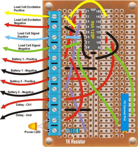 Here is a layout/wiring chart for the completed board. (Please accept my apologies if you have tried to make this amp from a previous version of this page - I had the labels for terminals 1 and 2 reversed. Terminal 1, Yellow, pins 4 and 15, is Load cell Excitation Positive Terminal 2, Red, Pins 5 and 12, (ground) is Load Cell Excitation Negative. Revised 3-7-05 |